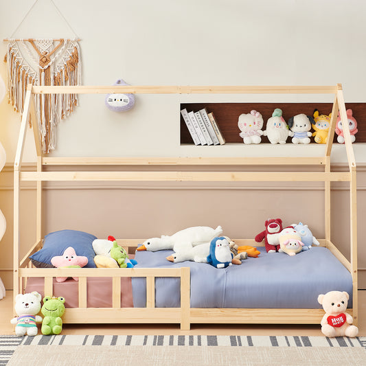 Kids Single House Bed Wood Floor Bed-Wood/White-PINEY