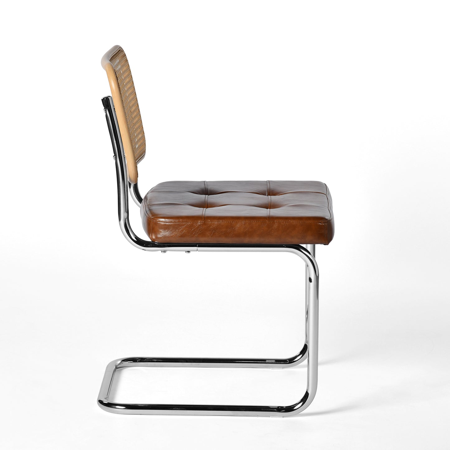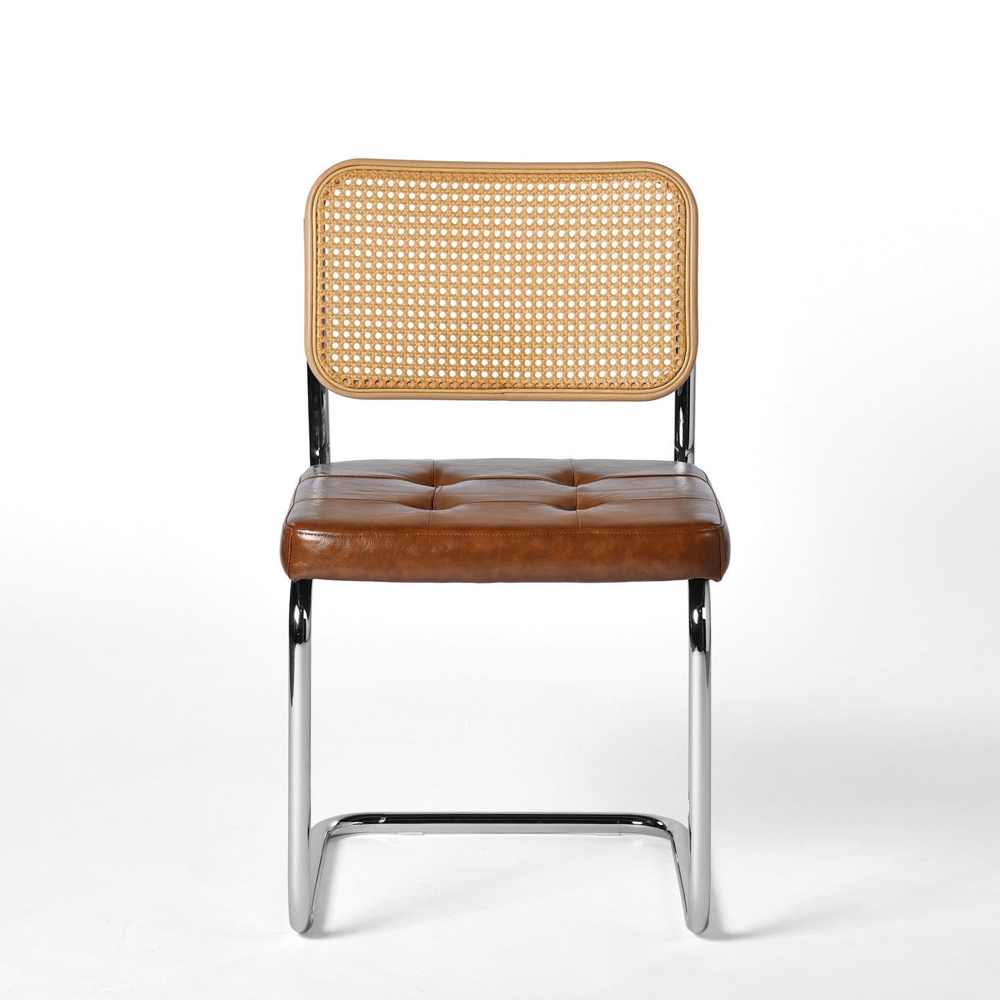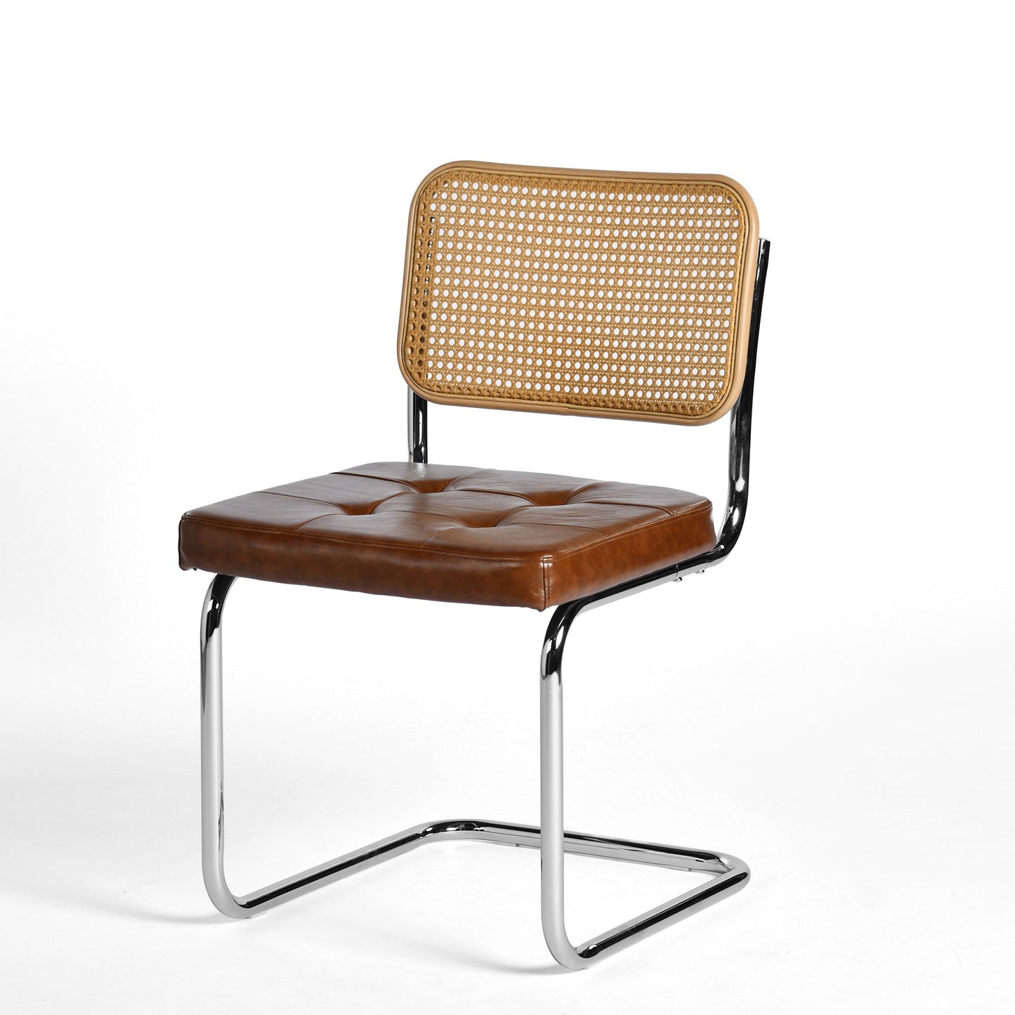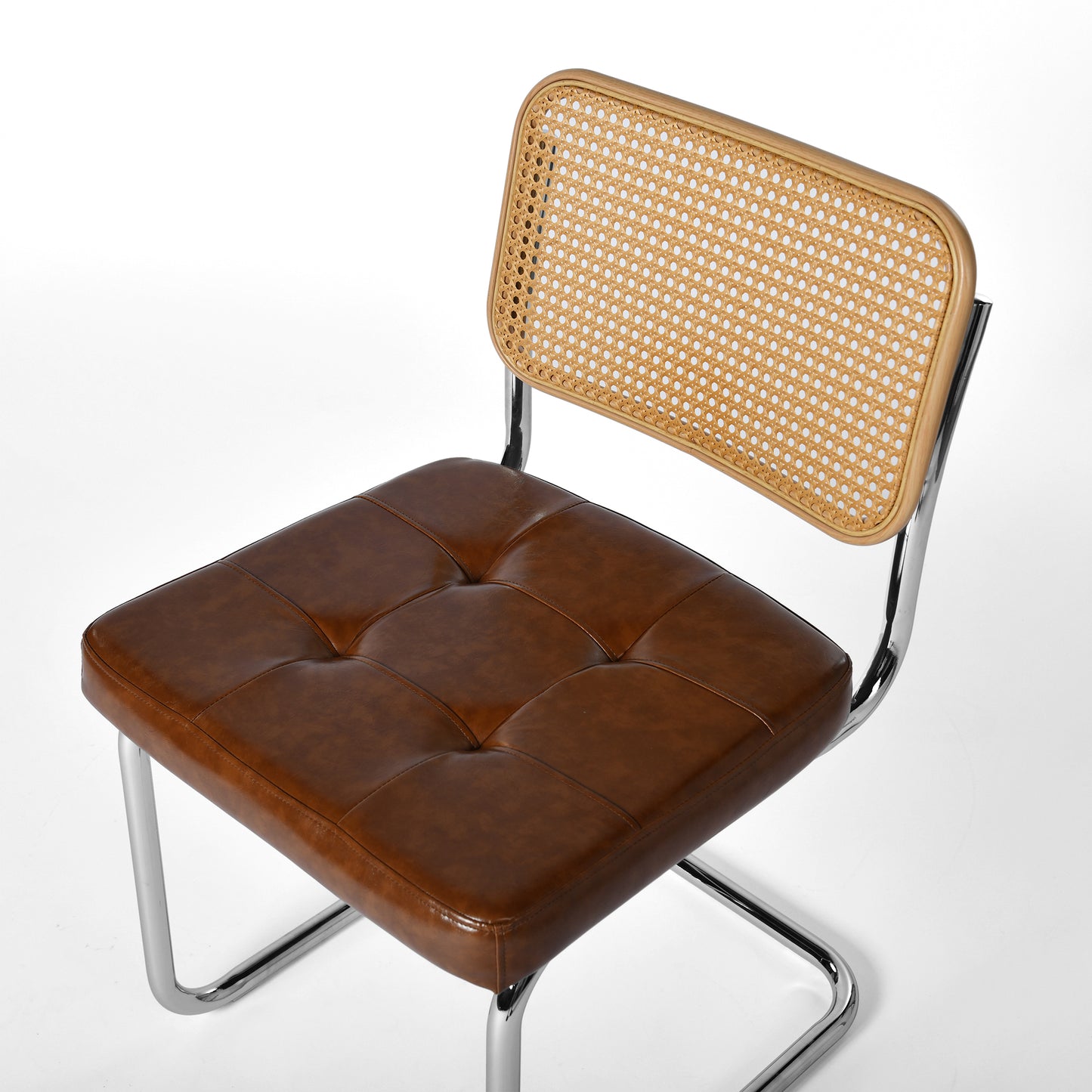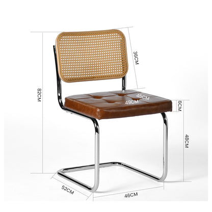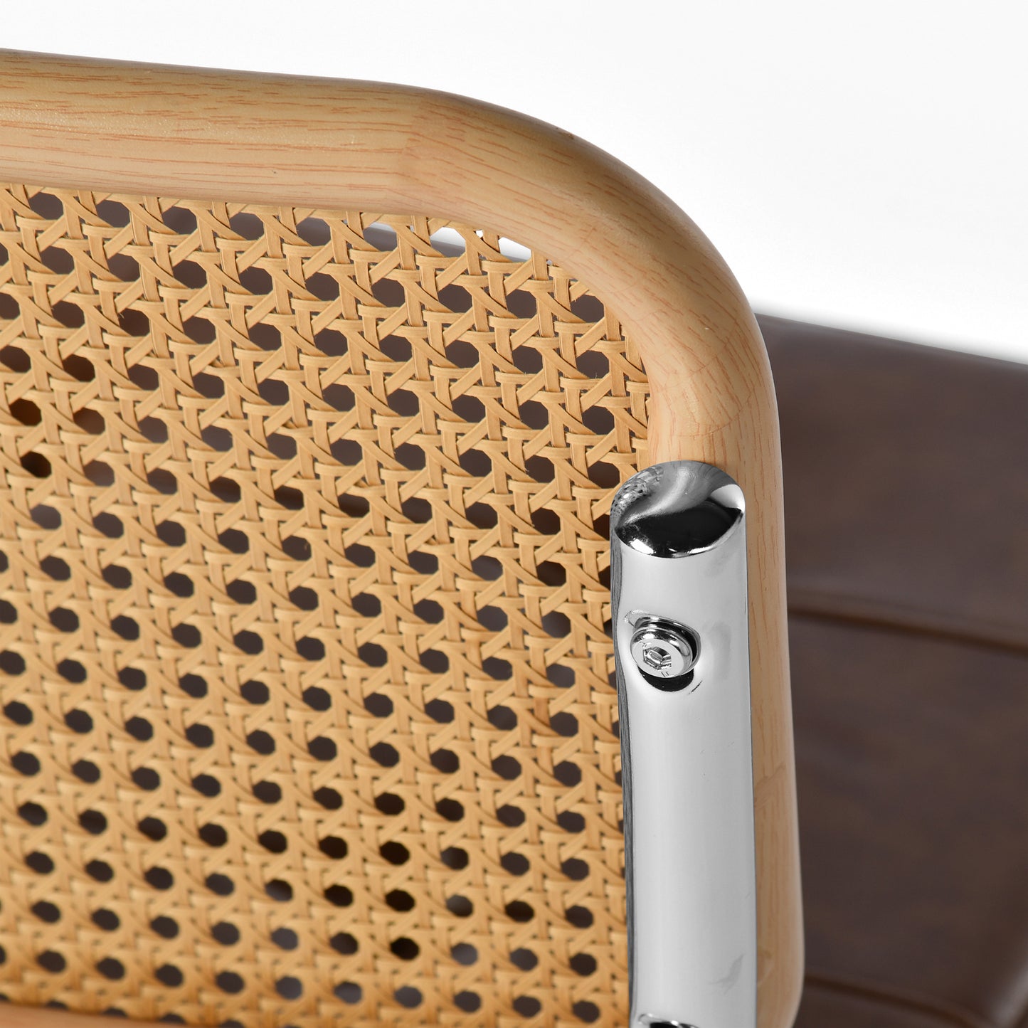 The chair back features intricately woven rattan-style material, retaining the breathability and flexibility of natural rattan while boosting durability through modern techniques. Paired with a chrome-finished metal legs, it embodies a fusion of organic and industrial beauty.