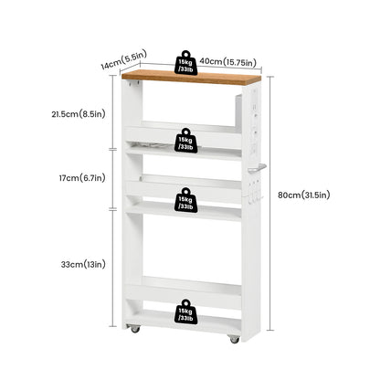 This 4-tier white storage cart is not only practical but also stylish, with the added convenience of the built-in power strip making your kitchen or bathroom feel more modern. It's a must-have for any household, providing both functionality and beauty.