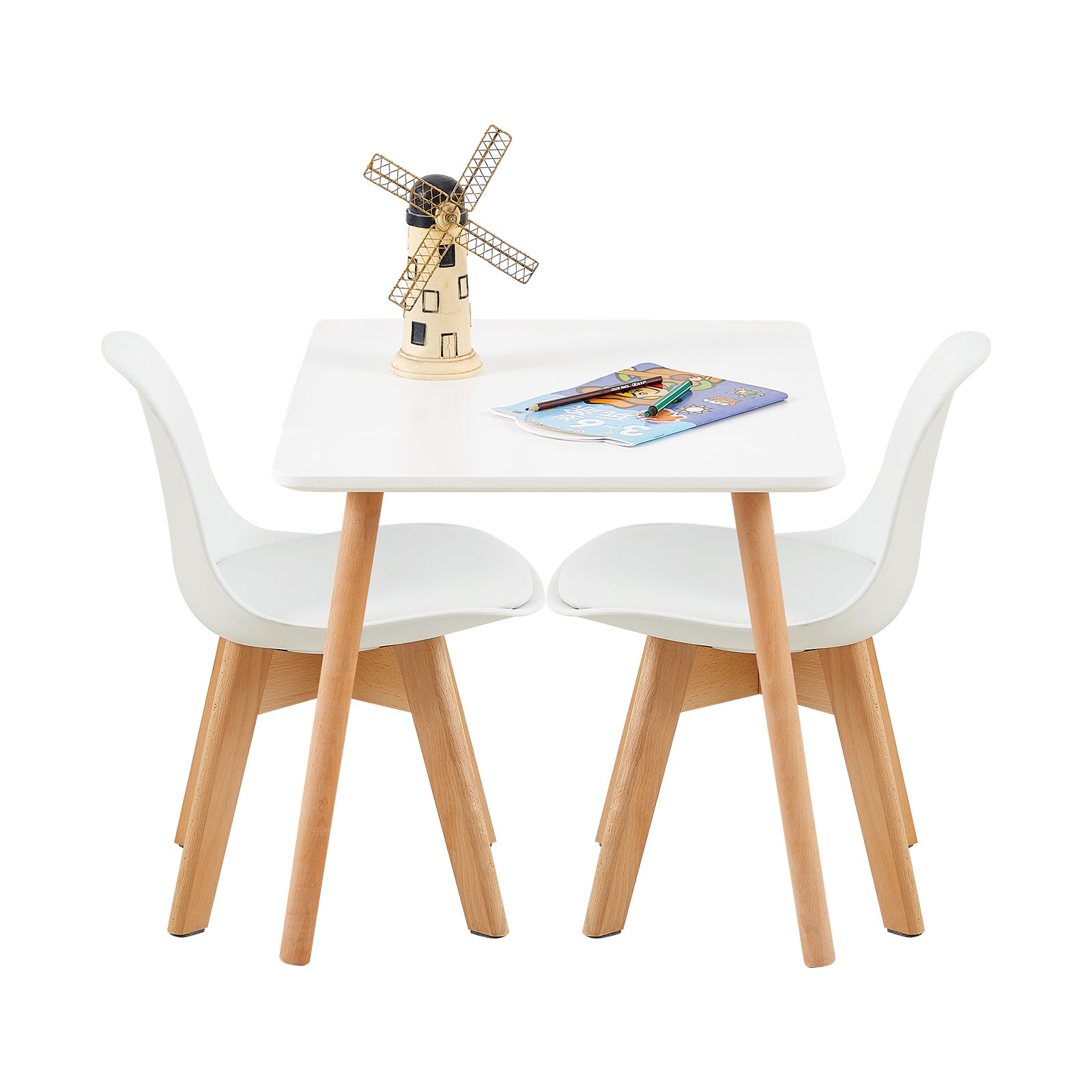 This kids table and chair set includes 2 cute chairs and 1 sturdy table, designed for kids ages 3-5. The table and chairs are made of high-quality beech wood legs, which are sturdy and durable and can withstand children's activities and play.
